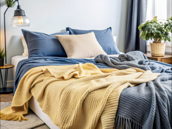 A Bed with a Yellow Blanket and a Blue Blanket on It