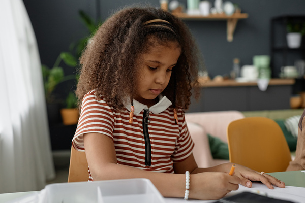 A Young Girl Sitting at a Table with a Pencil and Paper