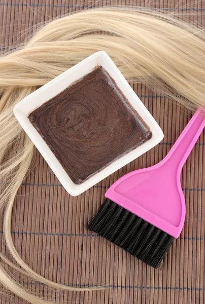 Hair dye in bowl and brush for hair coloring on brown bamboo mat, close-up