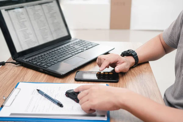 Service staff use smartphone calculate cost of repairing the car from the damage assessment document and use laptop on table office service center