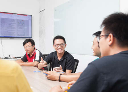 Asian business people group meeting room collaboration colleagues discussing conference desk real office team