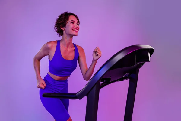 Photo of determined sporty lady run on treadmill fast speed for buying sport equipment sale isolated neon ultraviolet background.