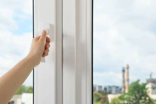 Woman opening white plastic window indoors, closeup. Space for text