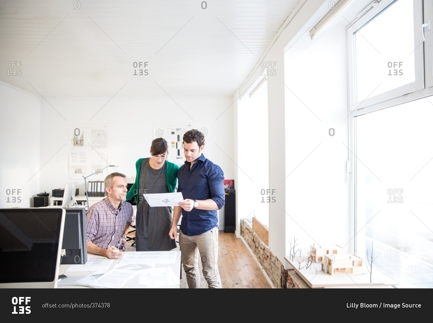 Colleagues at desk in office discussing paperwork