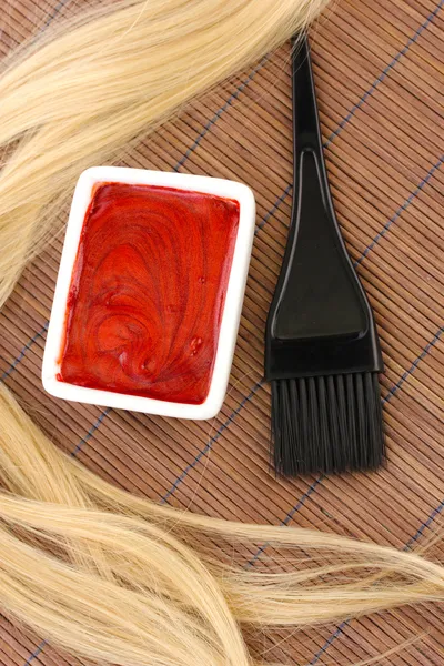 Hair dye in bowl and brush for hair coloring on brown bamboo mat, close-up