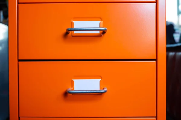 Filing cabinet with closed drawer, 2 white cards for write letter, Orange metal colour, Administration and storage concept, closeup & Macro shot