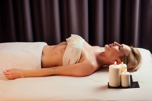 beauty blonde glamour female in spa eyes closed enjoying head massage at spa center professional therapy health stress treatment pampering facial beauty skin:anti acne and anti wrinkles