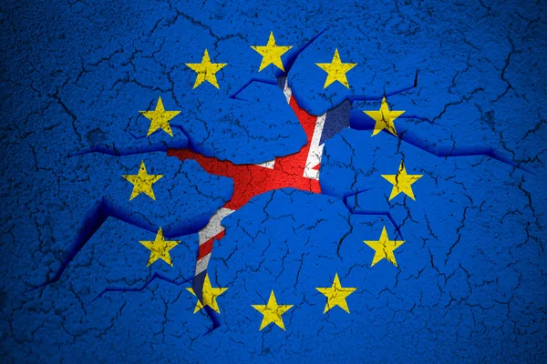 Brexit blue european union EU flag on broken crack wall with hole and uk england great britain flag inside