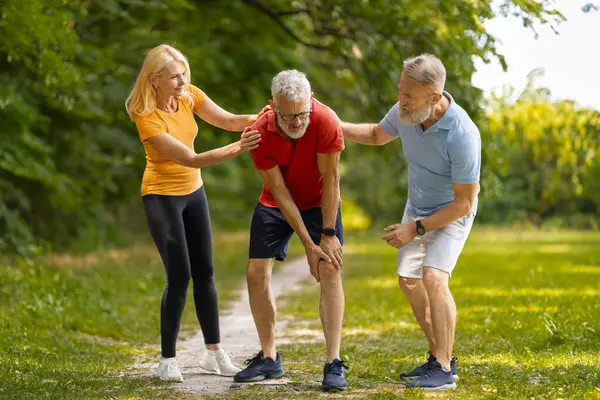 Concerned senior couple helping their male friend recover from injury during outdoor training, elderly man suffering muscle cramp or knee trauma after jogging in green park, free space