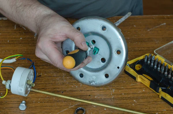 Repair of a water heater part 3 7. The man s hands tighten the screw on the boiler flange with a screwdriver. Service and repair of household appliances.