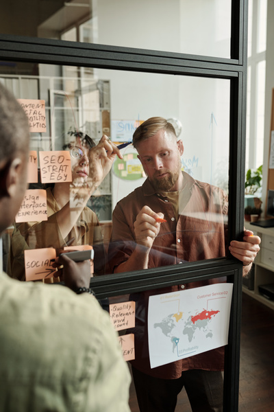 A Female Startupper Attaches a Sticker to a Glass Board