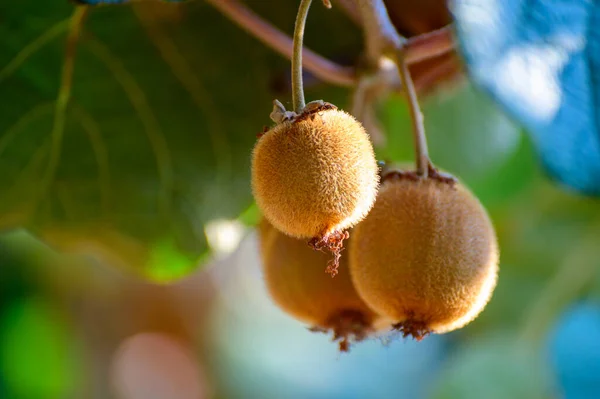 New harvest of golden or green kiwi, hairy fruits hanging on kiwi tree in orchard in Italy