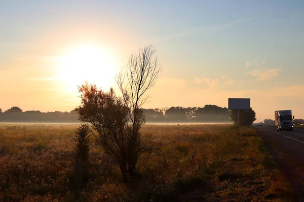 Dawn outside the city. Autumn begins. A huge sun rises over the yellowed grass. Morning fog. On the road there are cars and trucks