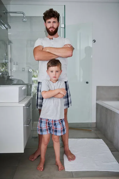 Like father, like son. Portrait of a father and his little son standing with their arms crossed in the bathroom at home.