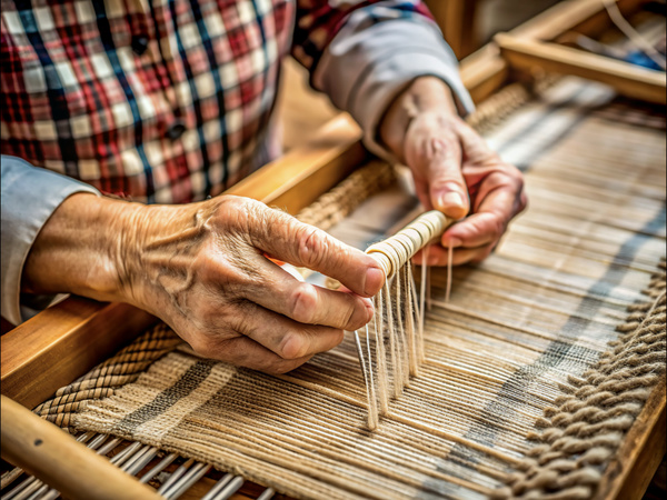 An Elderly Person Weaving on a Loom with a Wooden Frame