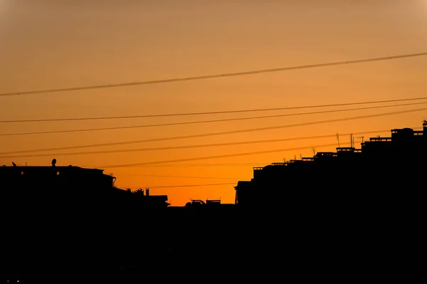 Orange sunset in the city. The roofs of high-rise buildings. Electrical cables and wires. Evening view of the city. Sunset.