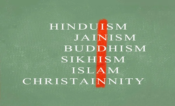 Concept of Unity in diversity of India showing with different religions on green chalkboard