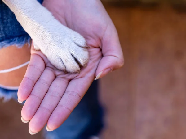Female hand and dog paw. A dog is a friend of man. Family is the most valuable thing in life. Family photo. Happiness.