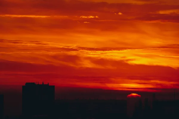 Sun rises over horizon. Fiery sunny circle. Cityscape with vivid red dawn. Amazing warm dramatic cloudy sky above dark silhouettes of city building roofs. Atmospheric background of sunrise. Copy space