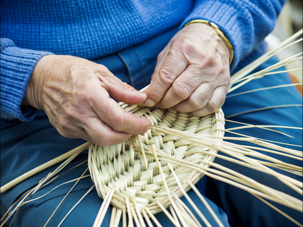 A Close up of a Person Weaving a Basket with Straws