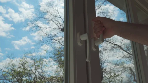 Hand closing or opening window, behind which you can see blue sky with clouds.
