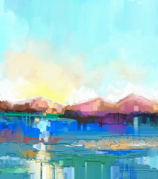 Abstract colorful oil painting landscape on canvas. Semi- abstract image of hill and field in yellow and green with blue sky. Spring season nature background