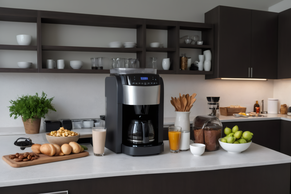 A Modern Kitchen with a Coffee Maker and a Variety of Foods