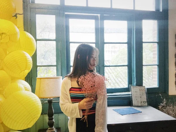 young woman with a cup of coffee in the interior