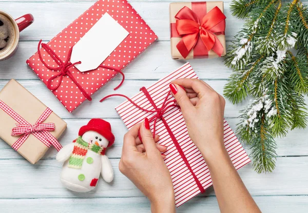 Female hands wrapping christmas gifts