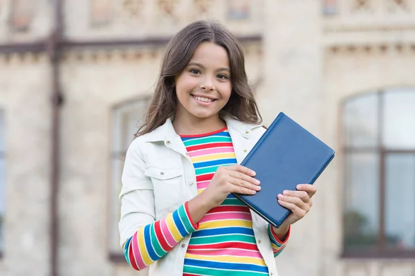 Required school reading list. Happy child hold book outdoors. School library. Little girl back to school. School and education. Knowledge day. September 1. Startup. Private teaching. Home schooling
