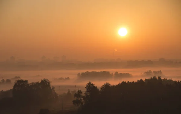 Bright beautiful dawn, the sun rises over the city, the light passes through the fog.