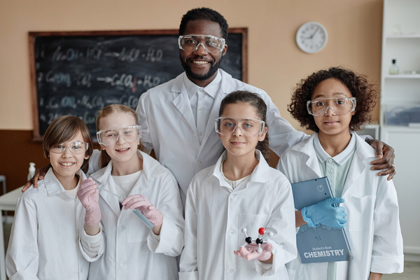 A Group of Kids in Lab Coats and Goggles