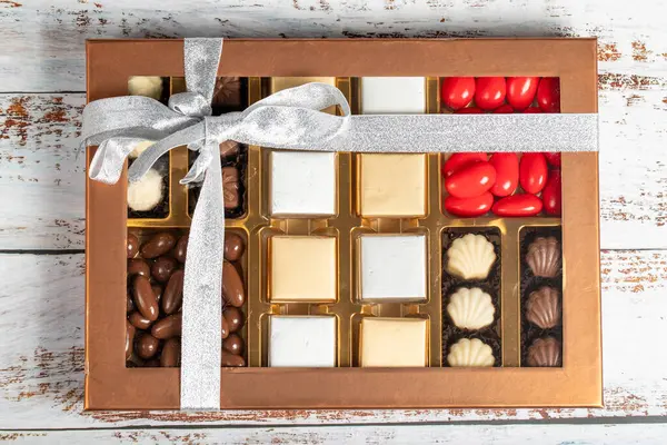 Packaged chocolate box. Pastry product. Gift chocolate box prepared with various chocolates on a white background. Top view