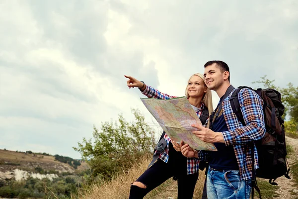 A young couple of tourists with a map in nature.