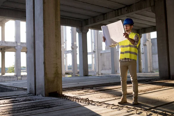 Portrait of male site contractor engineer with hard hat holding blue print paper at construction site,