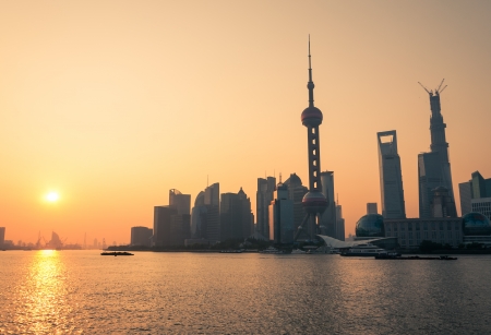 The sun rises over the skyscrapers of Shanghai