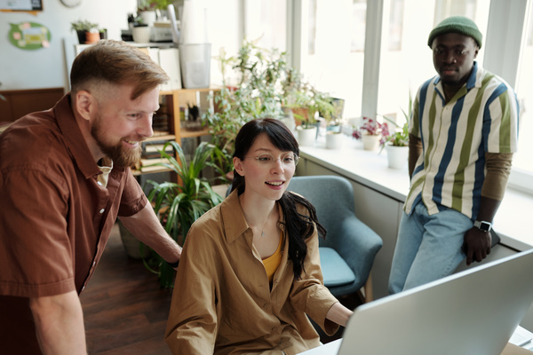 A Woman Looks at the Screen with Colleagues