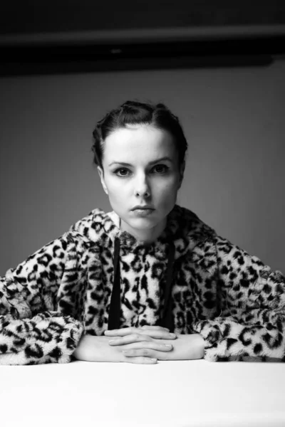 woman in leopard print, black and white art portrait