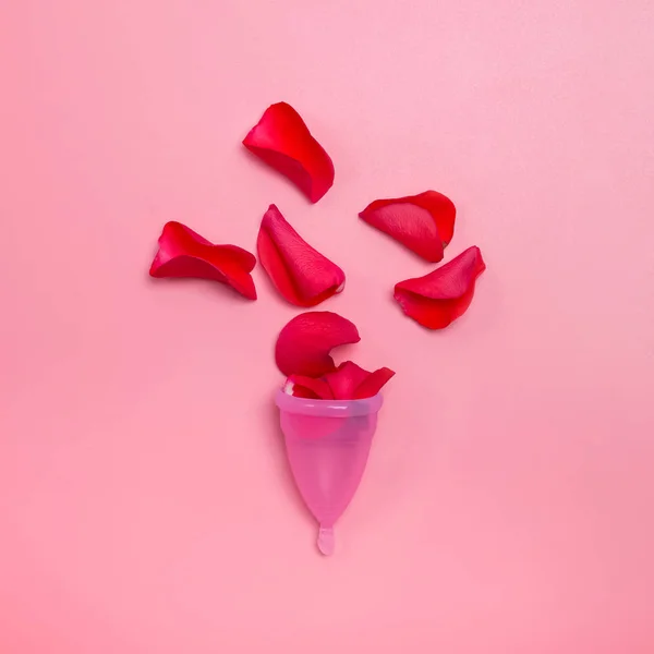 Womans period concept. Menstrual cup and red rose petals symbolizing blood.