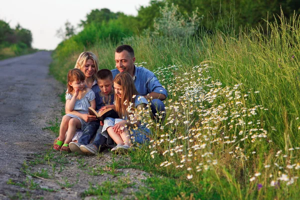 young and happy family with children reading the Bible in nature