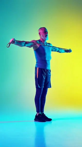 Muscular elderly man in sportswear training with resistance band against gradient green yellow background in neon light. Concept of sport, active elderly lifestyle, health care