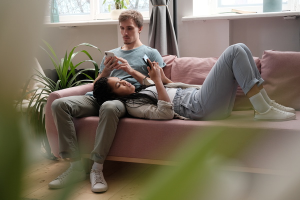 Couple with Phones Lay on Couch Indoors