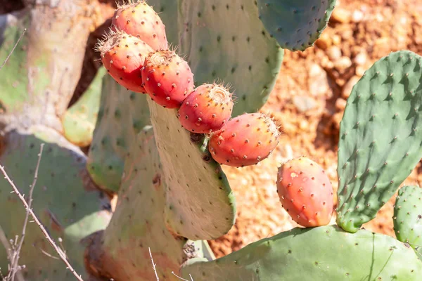 Prickly pear cactus close up with fruits in red color. Opuntia, commonly called prickly pear, is a genus in the cactus family, Cactaceae. Prickly pears are also known as tuna (fruit), sabra, nopal