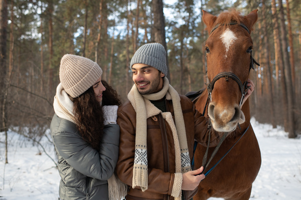 A Loving Couple with a Horse in the Winter Forest