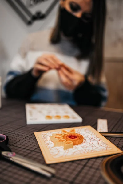 Paper art designer and artist working in her studio or workshop. She is wearing protective face mask against virus pandemic.