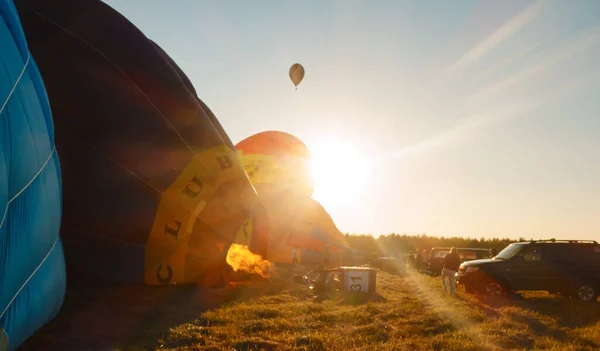 The burner fire heats the air inside the balloon for flight. One balloon in the sky and several more are preparing to fly in the evening at sunset