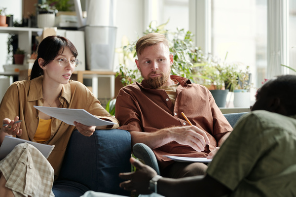 A Woman Holding Documents Talks to a Working Partner
