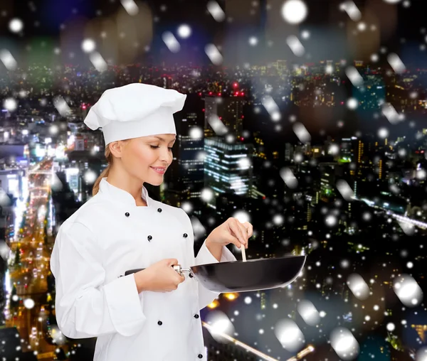 Smiling female chef with pan and spoon