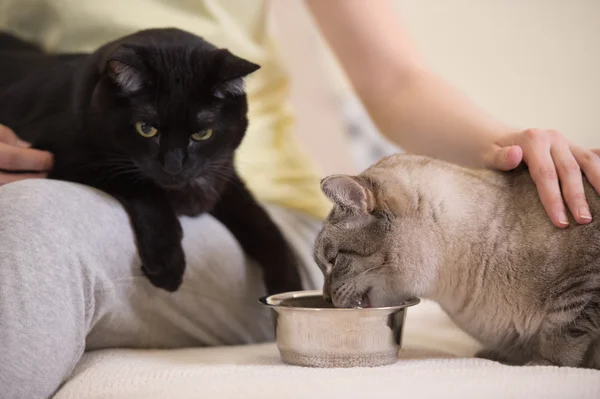Unrecognizable woman feeding her two cats at home