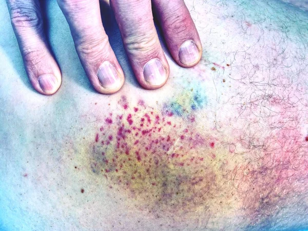 Fresh bruise on white skin. Painful green purple huge bruise on male leg. The subcutaneous injury on human skin